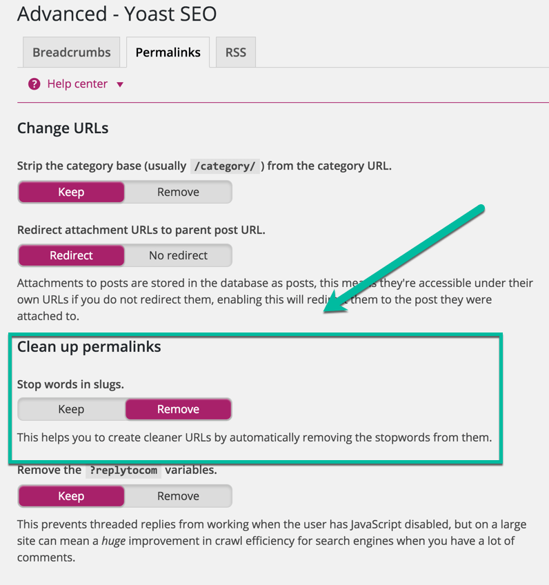 El uso de stop words no se considera necesario en las URL. Por lo tanto, puedes tenerlo en cuenta de acuerdo a las necesidades específicas de tu negocio. Si estás utilizando la plataforma de WordPress, puedes usar el plugin Yoast SEO para eliminar automáticamente las stop words del enlace permanente: