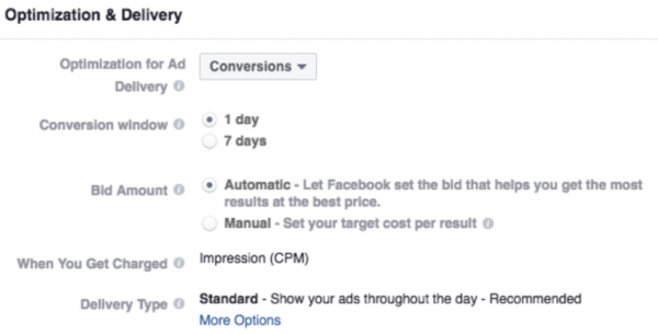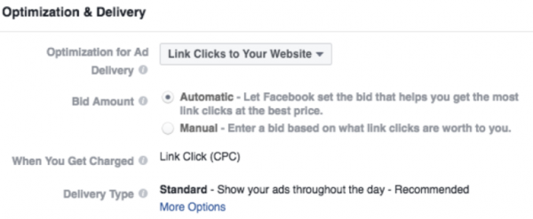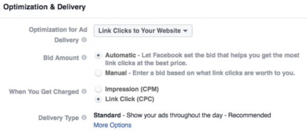 Para configurar esta prueba en una campaña con un objetivo de clics en el sitio web, configura la optimización para la publicación de anuncios para vincular los clics a tu sitio web. Como se muestra a continuación, Facebook proporciona la opción de pagar por impresión (CPM) o clics de enlace (CPC).