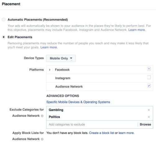 Asegúrate de excluir categorías para Audience Network para evitar mostrar anuncios en ciertos sitios o aplicaciones.
