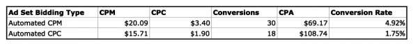LA imagen inferior muestra los datos de un test entre pujas automáticas CPC y pujas automáticas CPM. La puja automática para CPC tuvo un CPM un 21,8% y un coste por click de un 44,12% comparado con el set de anuncios configurado para CPM. La tasa de conversión fue superior para el conjunto de anuncios que pujaban por CPM, pero causó un incremento del coste por adquisición golbal de toda la campaña. El cambio en la estrategia produjo un coste inferior por visitante desde Facebook , pero cambiar la optimización de conversiones a clicks produjo una reducción de la tasa de conversión. Este es un gran ejemplo de porqué debes probar nuevas estrategias de puja antes de implementarlas.