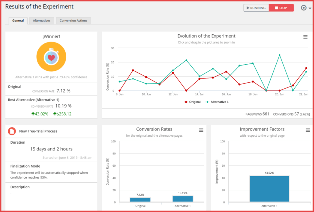 Por ejemplo, tendrás que crear dos páginas separadas en WordPress y, a continuación, introducir esas URL en la interfaz de Google Optimize. Luego, Google Optimize ejecutará la prueba y te proporcionará análisis detallados: