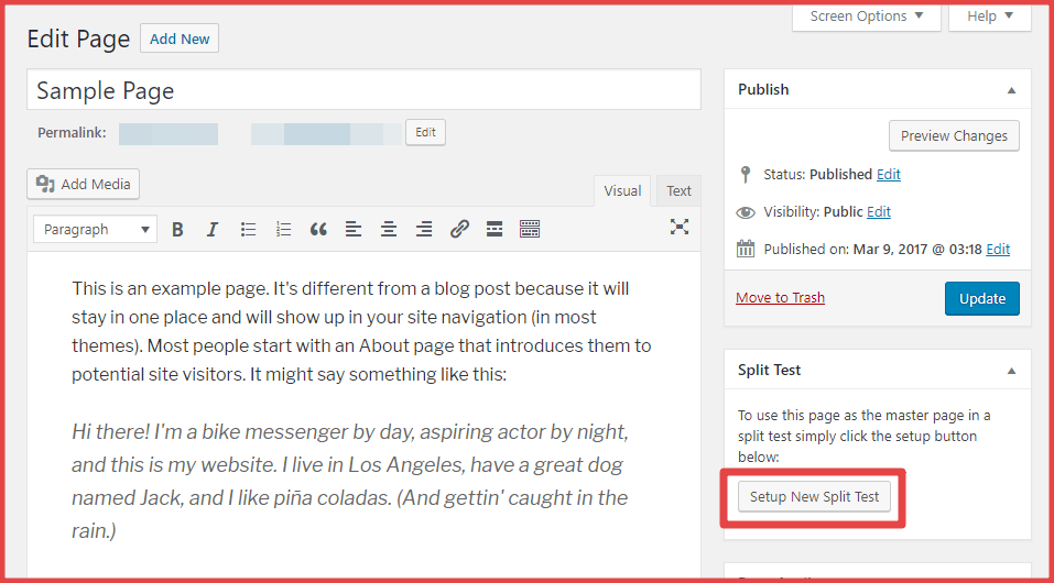 El plugin es fácil de usar. Después de instalarlo, tendrás el botón Setup New Split Test (que quiere decir configurar nuevo test de división) cuando edites cualquier post o página: