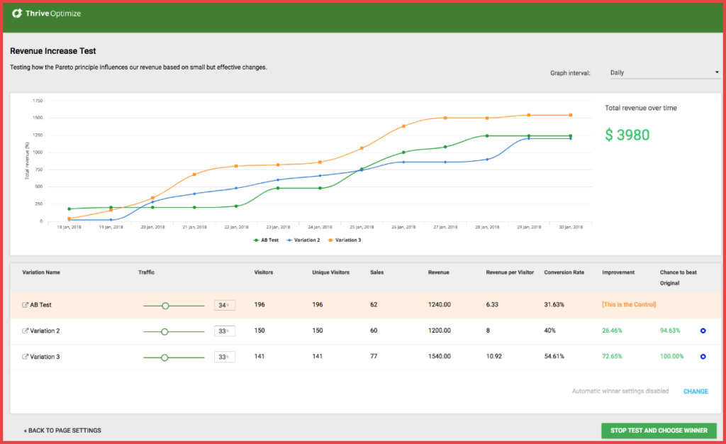 Luego, Thrive Optimize te proporcionará análisis detallados. Incluso puedes hacer que Thrive Optimize use estadísticas para declarar automáticamente a un ganador, de modo que nunca tendrás que pensar en tu A/B test después de iniciarla: