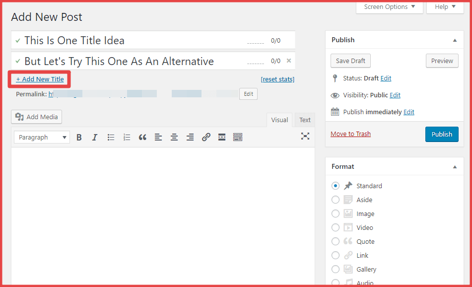 El plugin, también tarda muy poco tiempo en configurarse. Una vez instalado y activado, puedes utilizar el botón + Añadir título nuevo para introducir uno o más títulos adicionales al crear contenido: