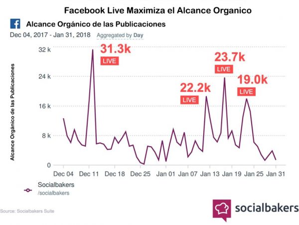 Cuando SocialBakers revisó el rendimiento de su contenido en el muro de noticias de Facebook, notaron que Facebook Live se desempeñó mucho mejor que los demás formatos de publicaciones. Veían subir su alcance orgánico en Facebook cada vez que publicaban una transmisión en vivo.