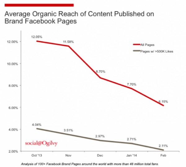 Y aún hay más, Social@Ogilvy analizó más de 100 páginas dentro de Facebook donde notó que el alcance orgánico promedio del contenido que publicaban en Facebook era sólo un 6%.