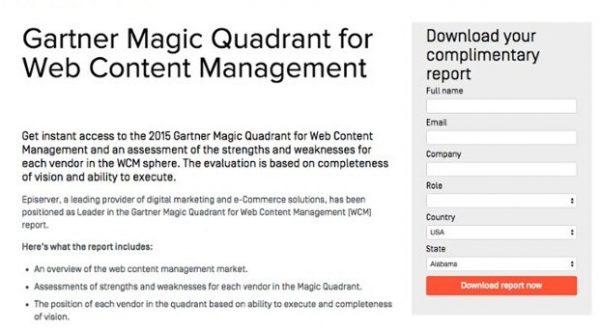 Vamos a darle un vistazo a Episerver, por ejemplo. Ellos utilizan los informes de contenido web para la generación de prospectos, y recaudan 6 datos de posibles clientes potenciales.