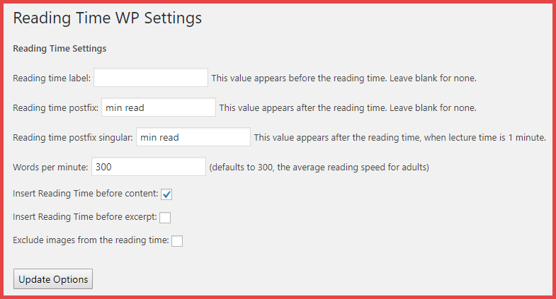 De igual forma, podrás decidir si deseas insertar el tiempo de lectura en tu contenido y resumen. Simplemente marca / desmarca las opciones que desees y no olvides guardar los cambios haciendo clic en el botón 'Actualizar opciones'.