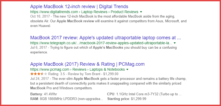 Una vez más, esto se debe a que el esquema de marcado ayuda que tu sitio web se destaque frente a las otras páginas de ranking para la misma palabra clave.