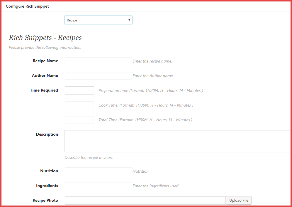 El All In One Schema Rich Snippets te permite añadir un cuadro de contenido a tu sitio con el esquema de marcado adecuado, al igual que el ejemplo de revisión que te mostré anteriormente. Por ejemplo, puedes agregar nuevo contenido a tu entrada para datos de recetas: