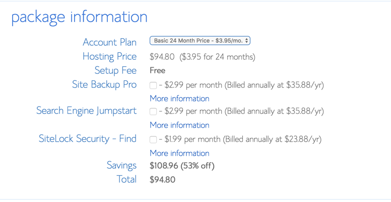 Elige tu paquete de hosting por un plazo de 24 o 36 meses. Notarás que el precio disminuye a medida que aumenta la tenencia.