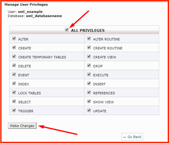 En la siguiente pantalla, asegúrate de darle al usuario TODOS LOS PRIVILEGIOS: