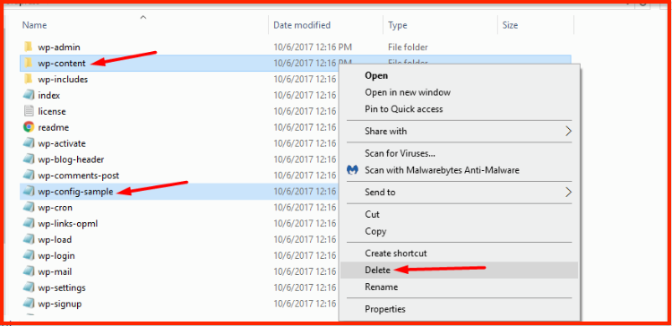 Luego, extrae el archivo ZIP y elimina la carpeta wp-content y el archivo wp-config-sample.php: