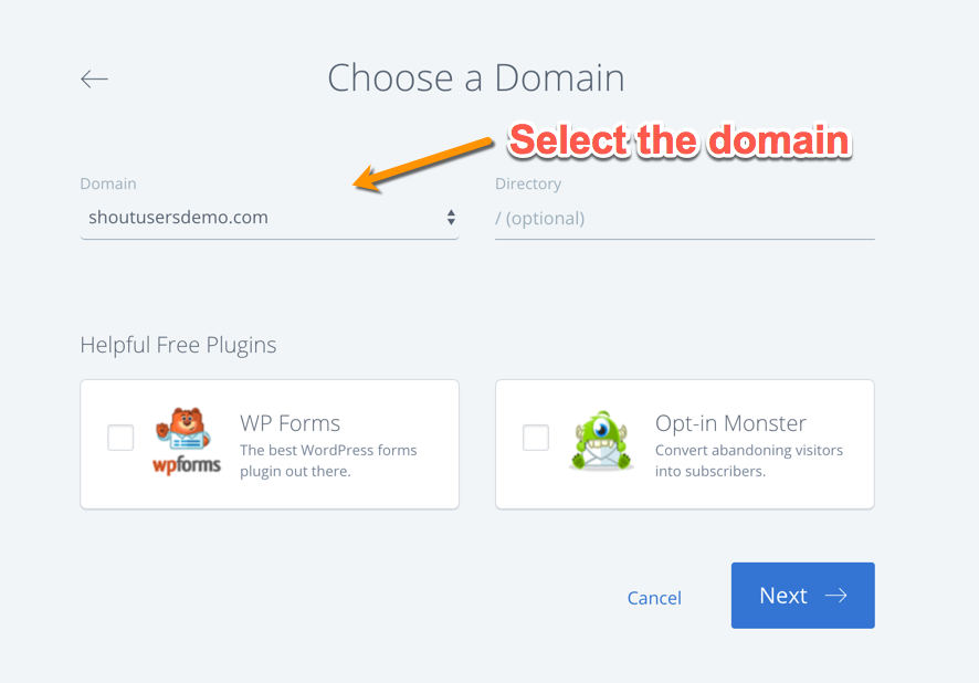 Haz clic en Siguiente y selecciona el dominio en donde quieres que se instale WordPress.