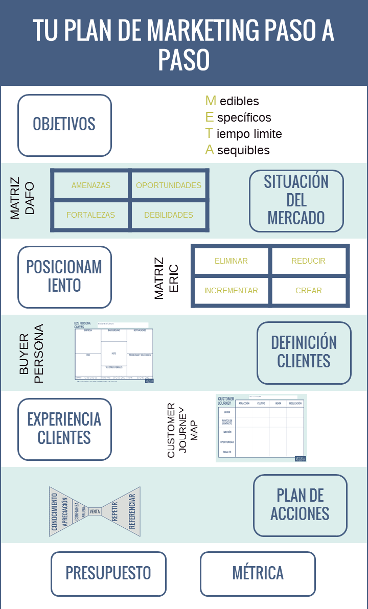 La idea en este punto es definir acciones más generales y poco a poco ir definiendo estrategias más específicas. De este modo tendrás una idea más clara del tipo de marketing que puedes usar para darle un “Plus” a tu estrategia.