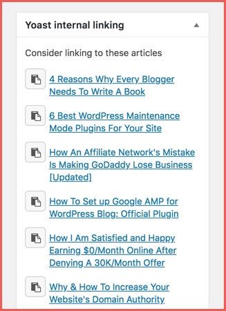 Recientemente, cambié de Yoast SEO gratis a la versión paga, y tiene una característica muy bonita llamada "Yoast internal linking", que recomienda el artículo relevante que uno podría usar para agregar dentro del artículo.