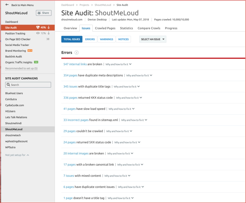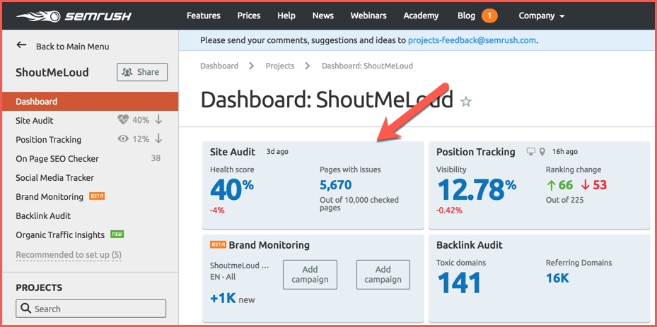 Para esto, tomaremos la ayuda de la función de auditoría del sitio de la herramienta SEMRUSH.