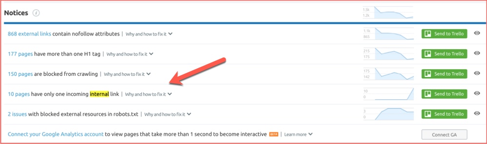 Si estás utilizando SEMRUSH, usa su función para encontrar páginas con enlaces entrantes bajos o puedes leer la siguiente sección, donde he compartido cómo puedes hacer lo mismo utilizando el plugin Yoast SEO WordPress.