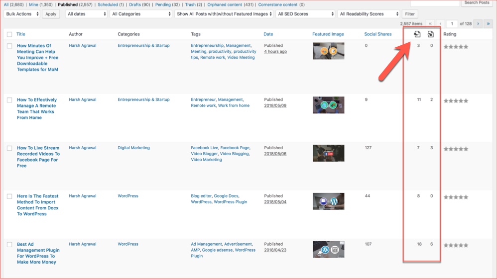 Aquí verás dos nuevas columnas que muestran la cantidad de enlaces internos salientes y el número de enlaces internos entrantes a la publicación.