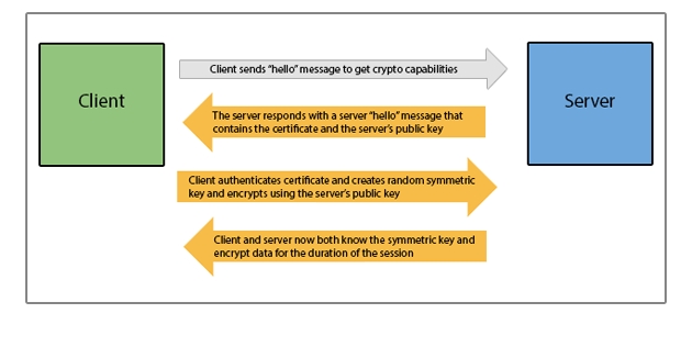 Se realiza una solicitud desde el extremo del cliente y el servidor responde con el certificado y la clave pública del servidor. El cliente / navegador luego verifica la validez del certificado SSL firmado por CA. Luego, el cliente / navegador envía una clave de sesión encriptada con la clave pública del servidor. Ahora, el servidor descifra la clave de sesión con su clave privada.