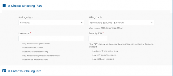 En este paso deberás ingresar la información del paquete de alojamiento. Puedes ahorrar más dinero registrándote por un período más largo en la sección "Billing cycle". Por ejemplo, el plan Hatching cuesta 36 dólares por un año (dominio incluido)