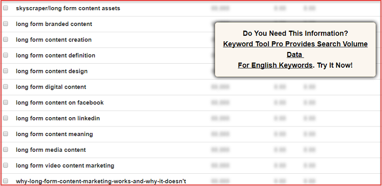 A continuación, se muestra un ejemplo de palabras clave de cola larga que obtuve de la popular herramienta keywordtool.io: