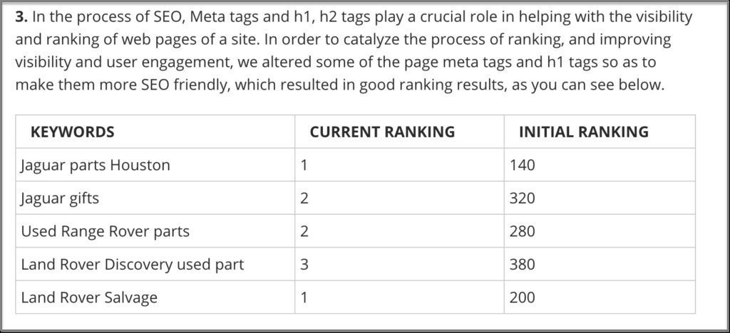 El siguiente cuadro, muestra el resultado de la clasificación de motores de búsqueda obtenido en una tienda local de piezas de automóviles en Houston, Texas, después de cambiar algunos de sus títulos de página y etiquetas H1: