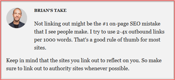 Según Brian, de Backlinko, "el no vincular podría ser el error número uno de on-page SEO que veo que las personas hacen. Intento utilizar enlaces de salida 2-4x por cada 1000 palabras. Esa es una buena regla general para la mayoría de los sitios".
