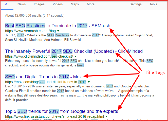 Las etiquetas de título son increíblemente esenciales; una etiqueta de título optimizada correctamente, mejorará drásticamente la visibilidad de tu página en los SERP. Por lo general, son lo primero que las personas ven cuando aparece tu contenido en los resultados de búsqueda.