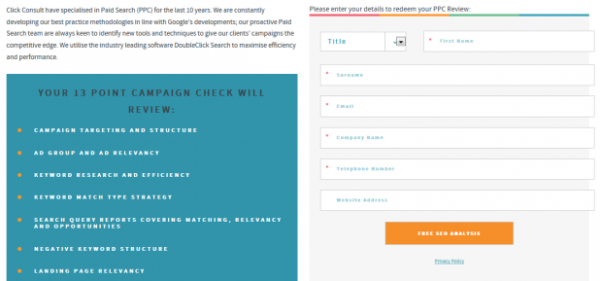 Tienen 7 campos para la oferta "Análisis SEO gratuito". Pero, el 7° campo "dirección del sitio web" ni siquiera es obligatorio.