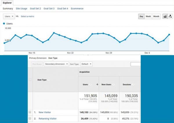 Estando en esta situación, ¿no sería algo maravilloso poder estar atentos al número de usuarios que visitan tu sitio web y cuántos de este número regresan? No debes Buscar más, tus métricas de Google analytics ya tienen este factor cubierto.