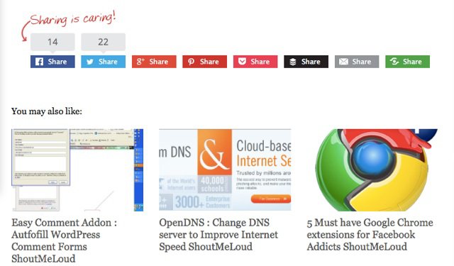 Shareaholic fue inicialmente un plugin de botón para compartir redes sociales y recientemente lo han renovado para añadir la característica de entrada relacionada.