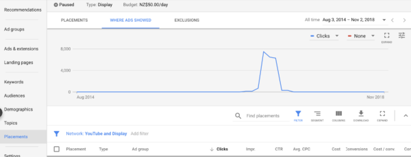 Lo complejo aquí es que si no has estado orientando activamente las ubicaciones (ya que es una campaña de remarketing), puede parecer que no posee su ubicaciones. Debes hacer clic en "donde se muestran los anuncios", esto te facilitará una lista de cada una de las ubicaciones en las que se muestran tus anuncios.