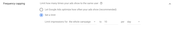 En cambio, tienes la opción de establecer un límite en el número de impresiones por cada anuncio, para cada grupo de anuncios o si deseas la campaña completa por día, semana o mes.