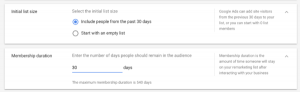 Cuando labores en Google Ads, tu primera audiencia de remarketing, tendrás la opción de crearlo velozmente con una membresía de 30 días como duración predeterminada. Esto quiere decir que el tiempo máximo que alguien permanecerá en esa lista es de 30 días.